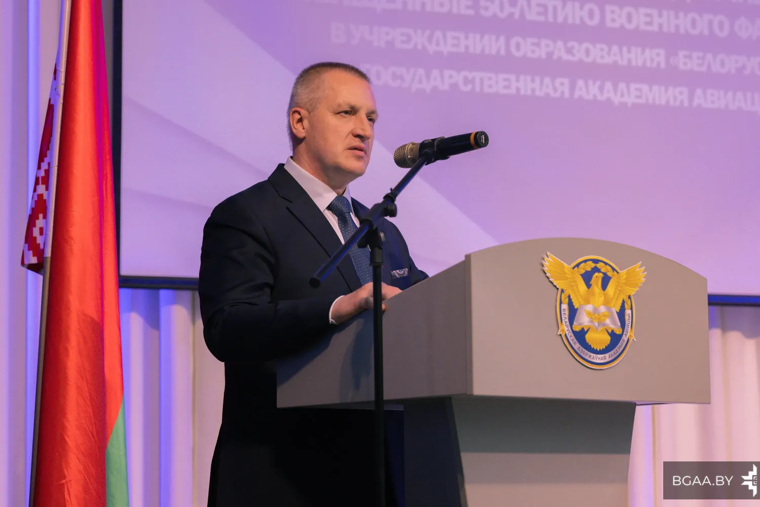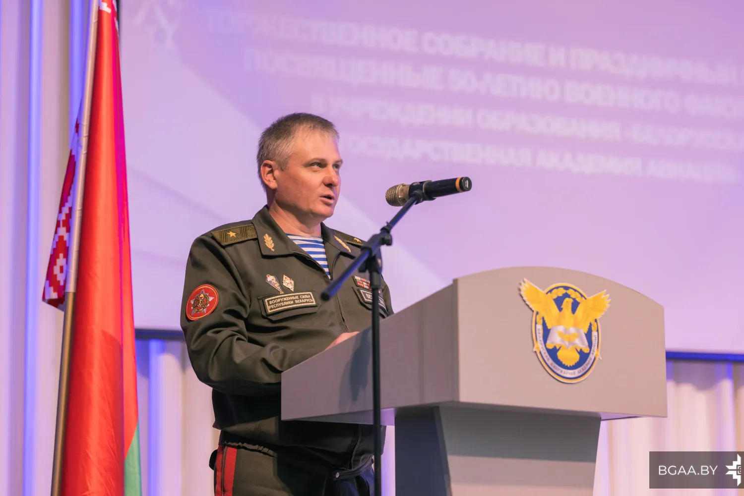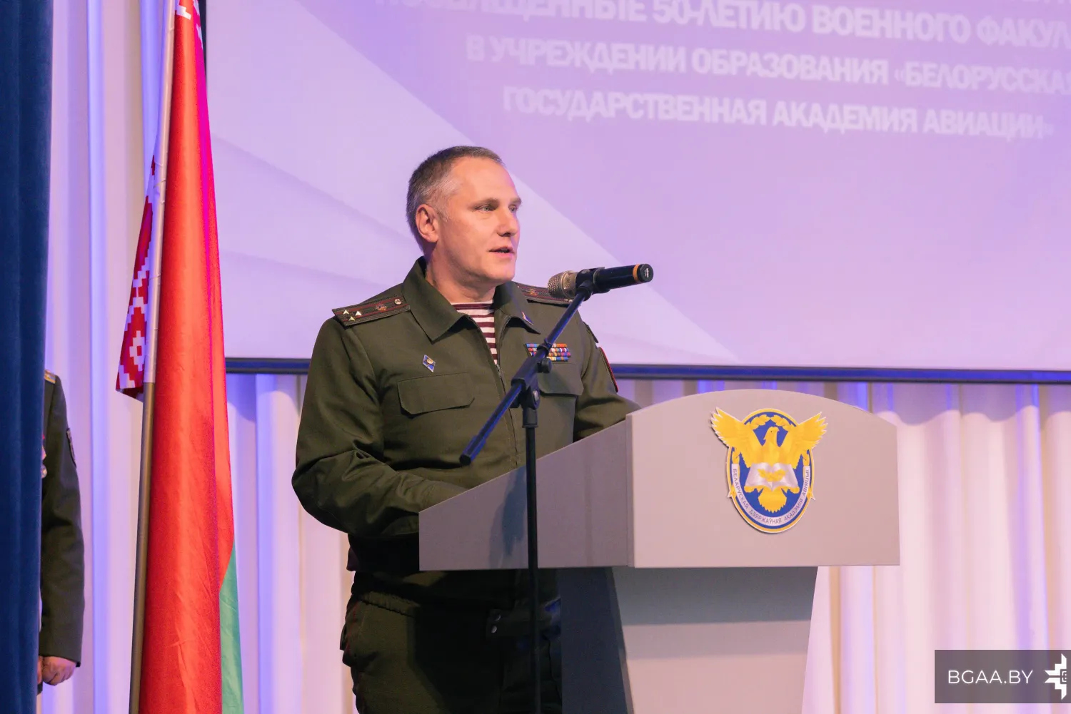 «Дорогие курсанты, уважаемые гости, ветераны военного факультета. Сегодня я имею честь в этот знаменательный день поздравить всех нас с 50-летием со дня основания военного факультета Белорусской государственной академии авиации». Генерал-майор выразил признательность ветеранам, заложившим прочный фундамент факультета, и пожелал нынешнему поколению курсантов и преподавателей успехов в нелегком труде по защите мирного неба Беларуси.