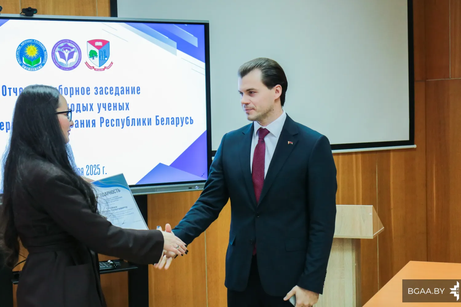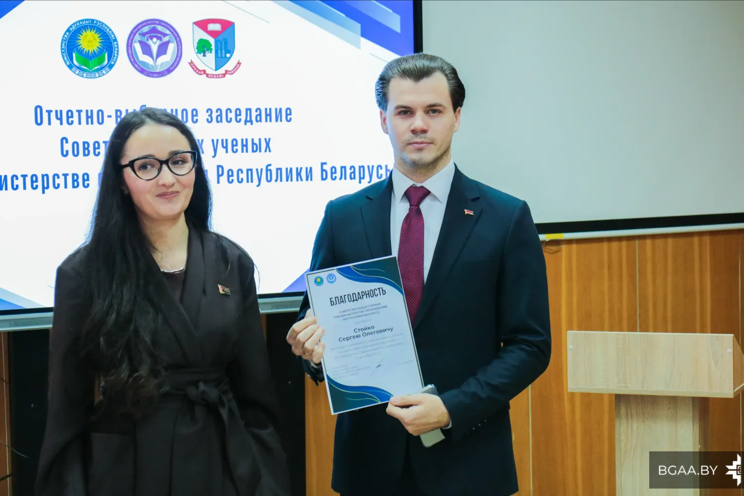 Приятным и значимым моментом заседания стало вручение благодарностей активным членам Совета молодых ученых за значительный вклад в развитие молодежной науки и поддержку инновационной деятельности. Среди отмеченных – председатель Совета молодых ученых Белорусской государственной академии авиации Сергей Стойко.