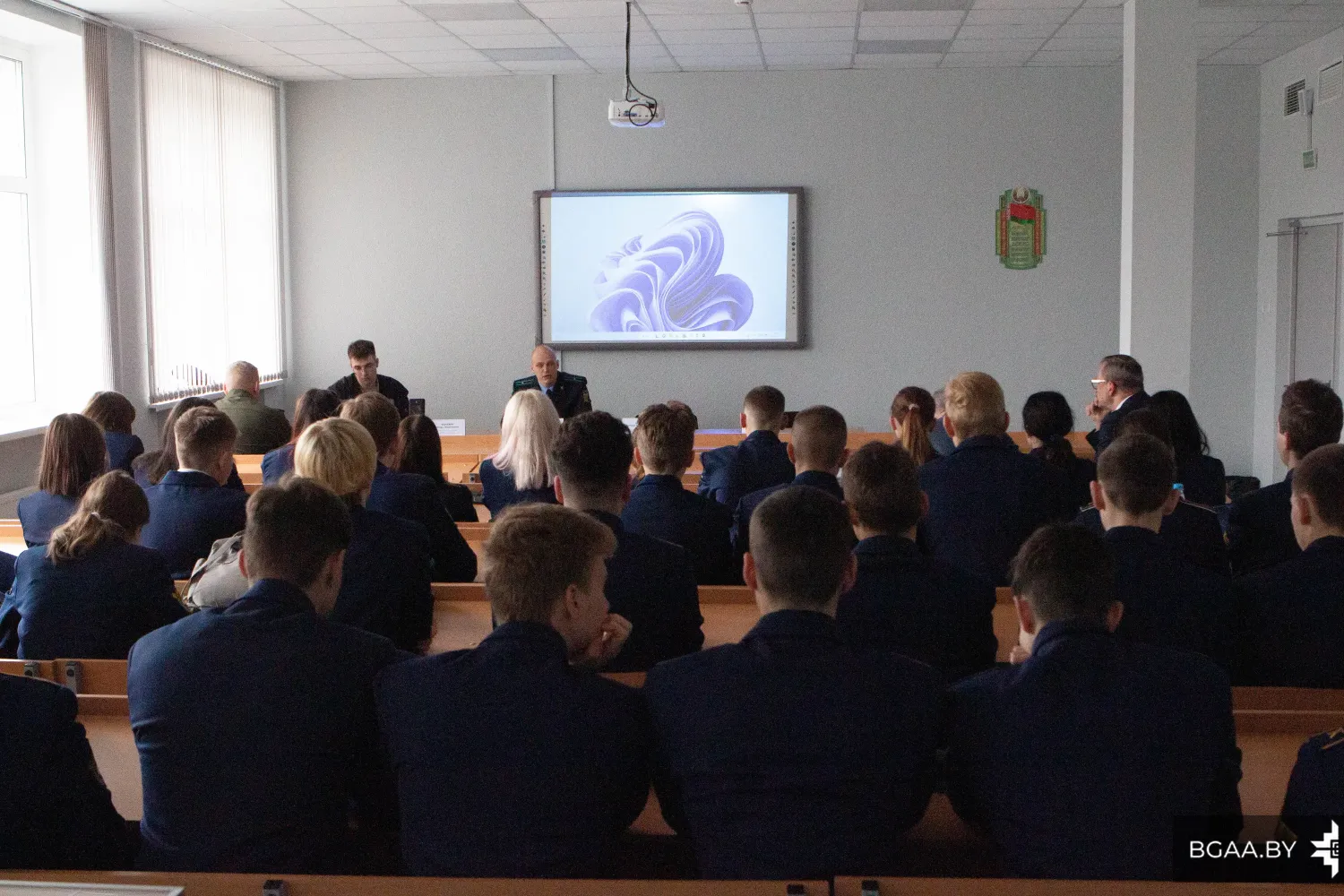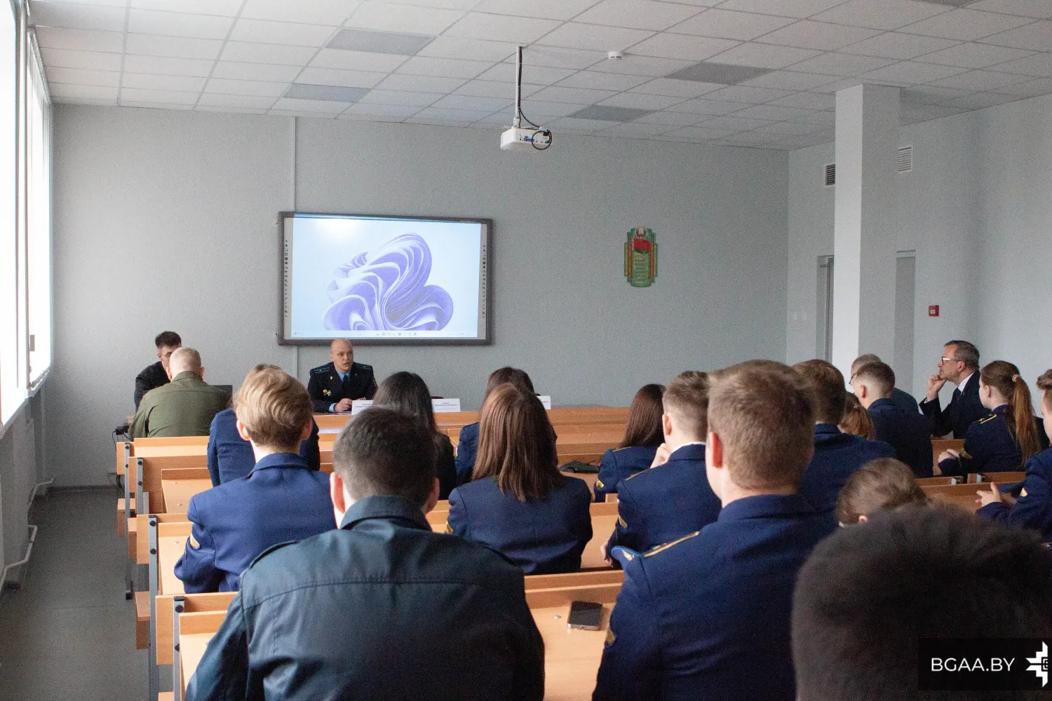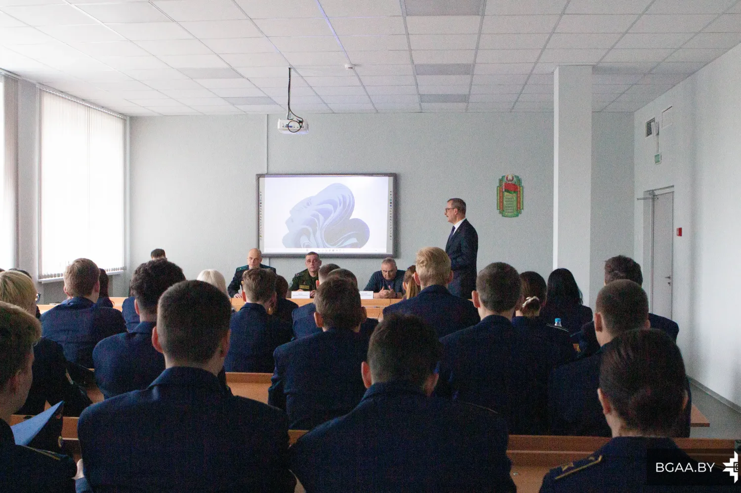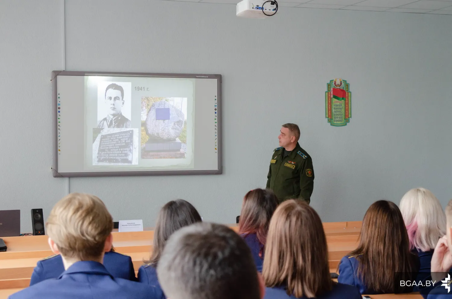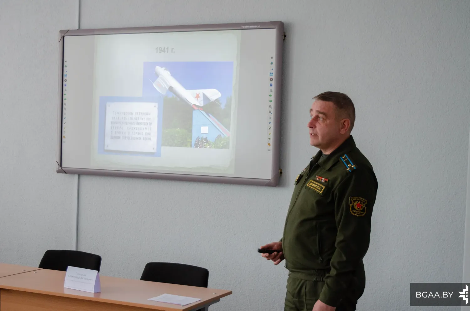 Дмитрий Александрович ознакомил курсантов с научной и поисковой деятельностью, связанной с увековечением памяти авиаторов, погибших на территории Беларуси в годы войны.