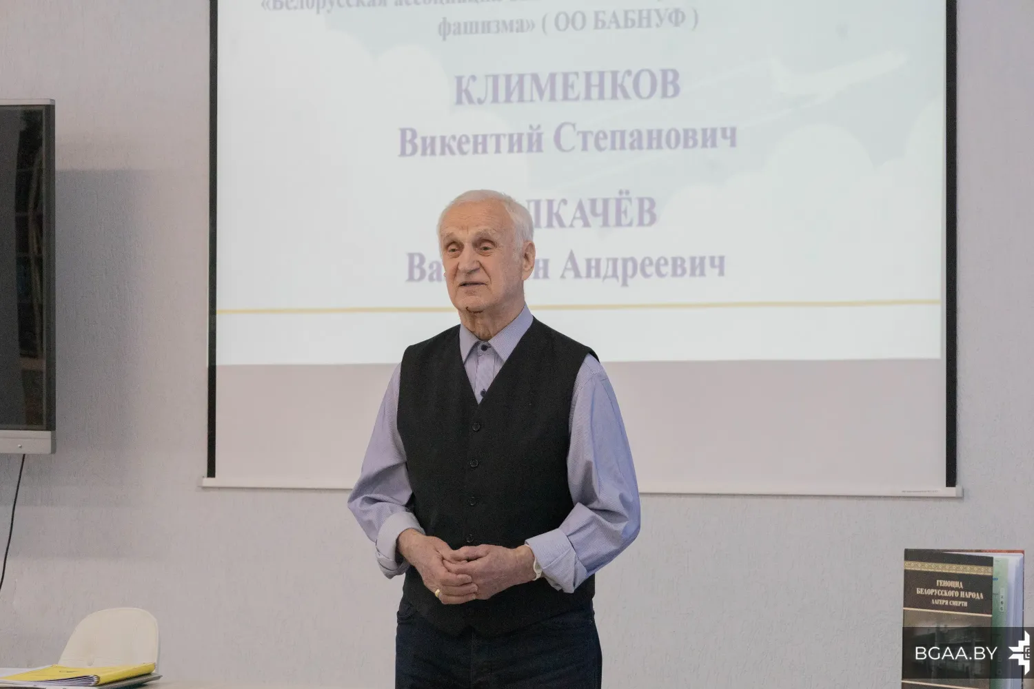 Заводскую районную организацию г. Минска общественного объединения «Белорусская ассоциация бывших несовершеннолетних узников фашизма» на встрече с курсантами представил Валентин Андреевич Толкачёв. Валентин Андреевич – кандидат педагогических наук, мастер спорта по туризму и альпинизму, член Союза писателей Беларуси, председатель Белорусского общественного объединения «Трезвенность-Оптималист».