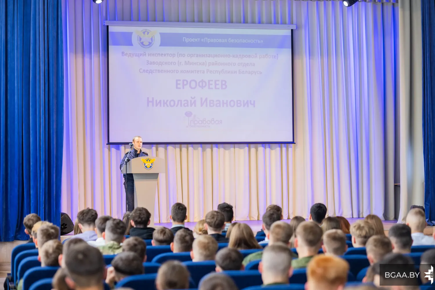 В рамках проекта «Правовая безопасность» в Белорусской государственной академии авиации состоялась встреча курсантов факультета гражданской авиации, военного факультета и отделения среднего специального образования с ведущим инспектором по организационно-кадровой работе Заводского районного отдела Следственного комитета Республики Беларусь Николаем Ивановичем Ерофеевым.
