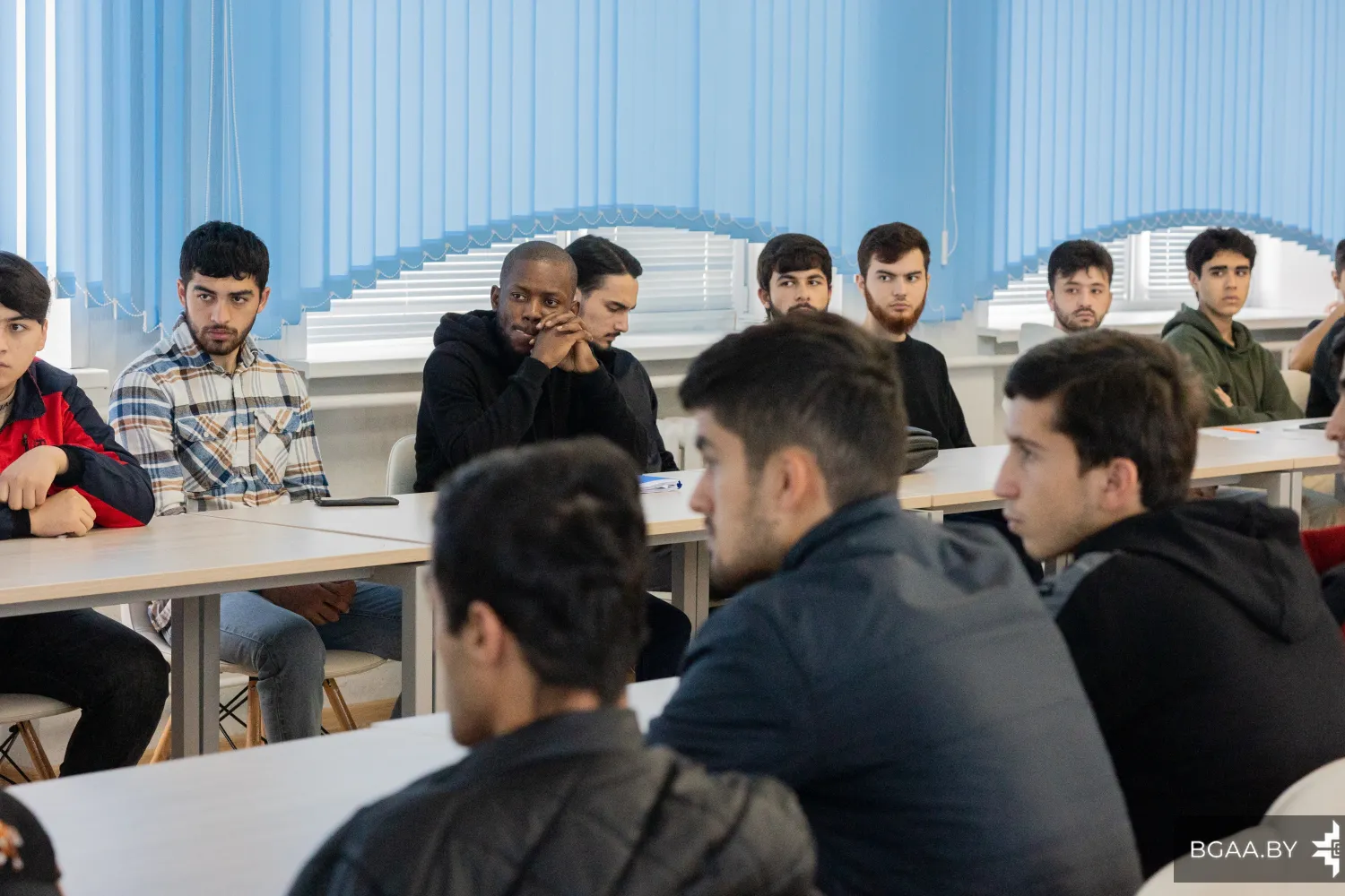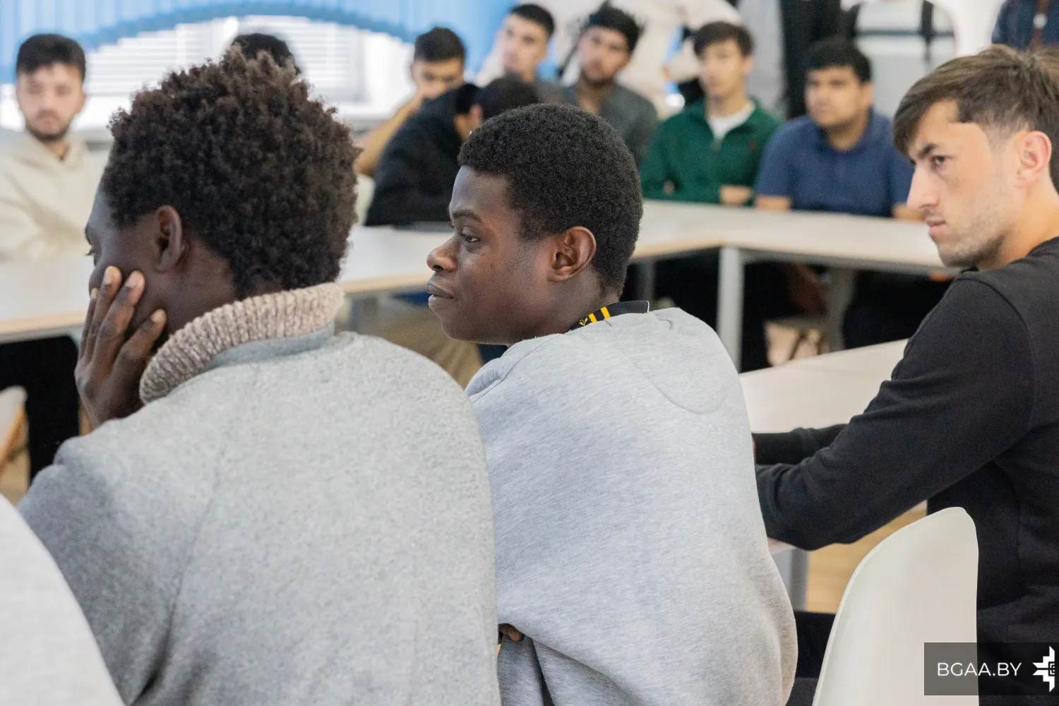 5 октября в рамках проекта «Правовая безопасность» состоялась встреча курсантов из числа иностранных граждан факультета гражданской авиации с представителями отряда пограничного контроля «Минск»: начальником управления оперативно-розыскной деятельности Константином Владимировичем Малявко и заместителем начальника 2-го управления оперативно-розыскной деятельности Владимиром Владимировичем Бачила.